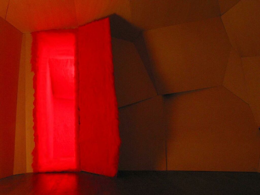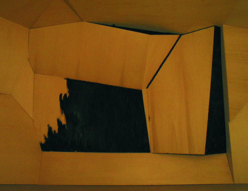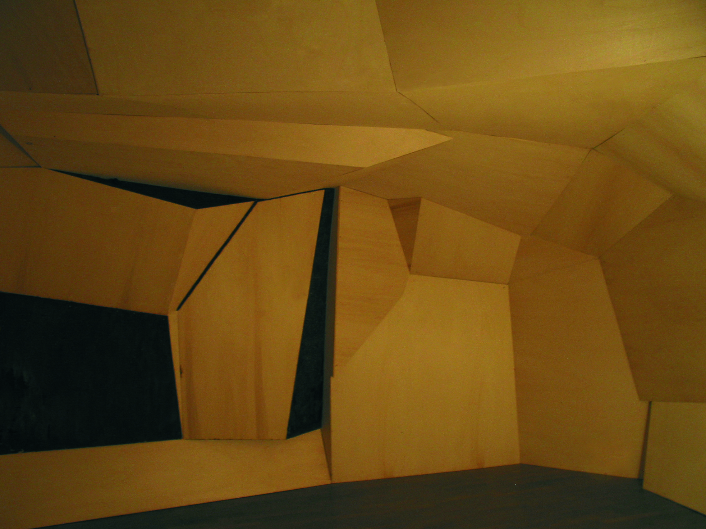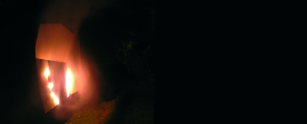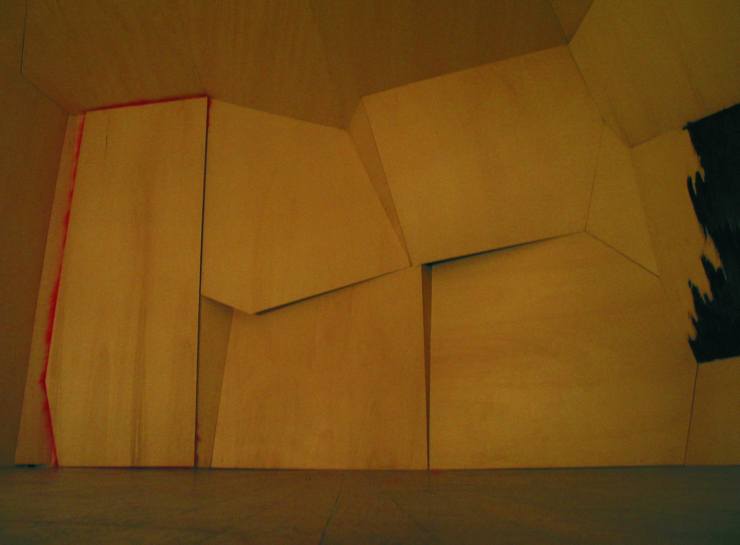 Datum 2008Ort Zumikon NürnbergMaterial roof battens, plywood, burned fire colourAbmessung installation size ca. 6 m x 4 m x 3 m