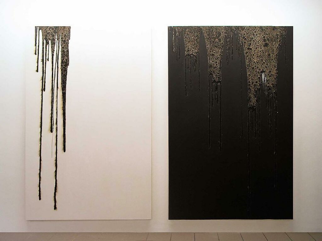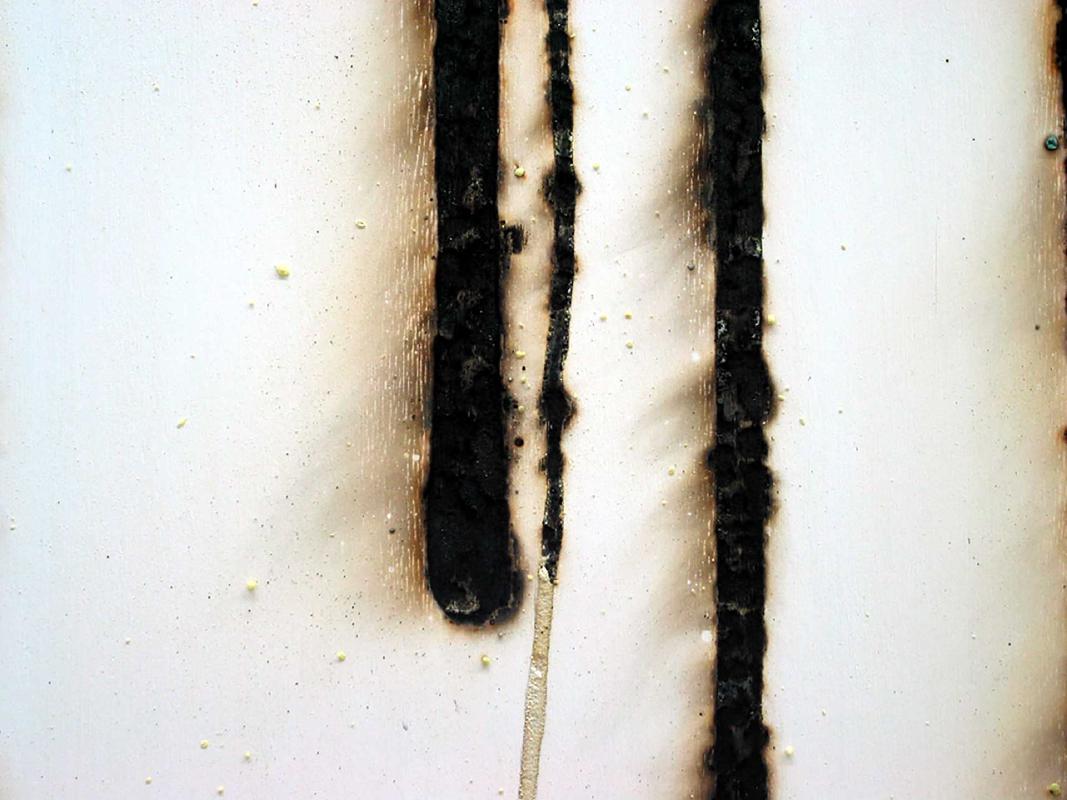 Datum 2009Material wood, acrylic paint, fire colour (burned)Abmessung each 2,40 m x 170 m
